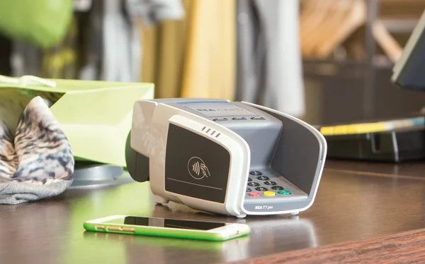 Falls Sie mit NFC zahlen möchten, präsentieren Sie die Karten an der linken Seite des EC-Terminals.