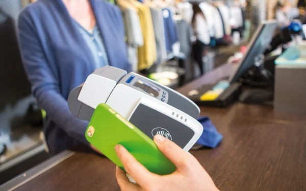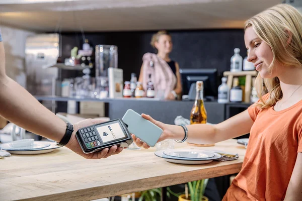 Beim kontaktlosen Bezahlen per NFC-Leser wird die Zahlung am Terminal mit der Girokarte, der Kreditkarte oder dem Smartphone blitzschnell ohne physischen Kontakt durchgeführt – ohne Einstecken der Karte und bei Beträgen unter 50 Euro auch ohne PIN und ohne Unterschrift.